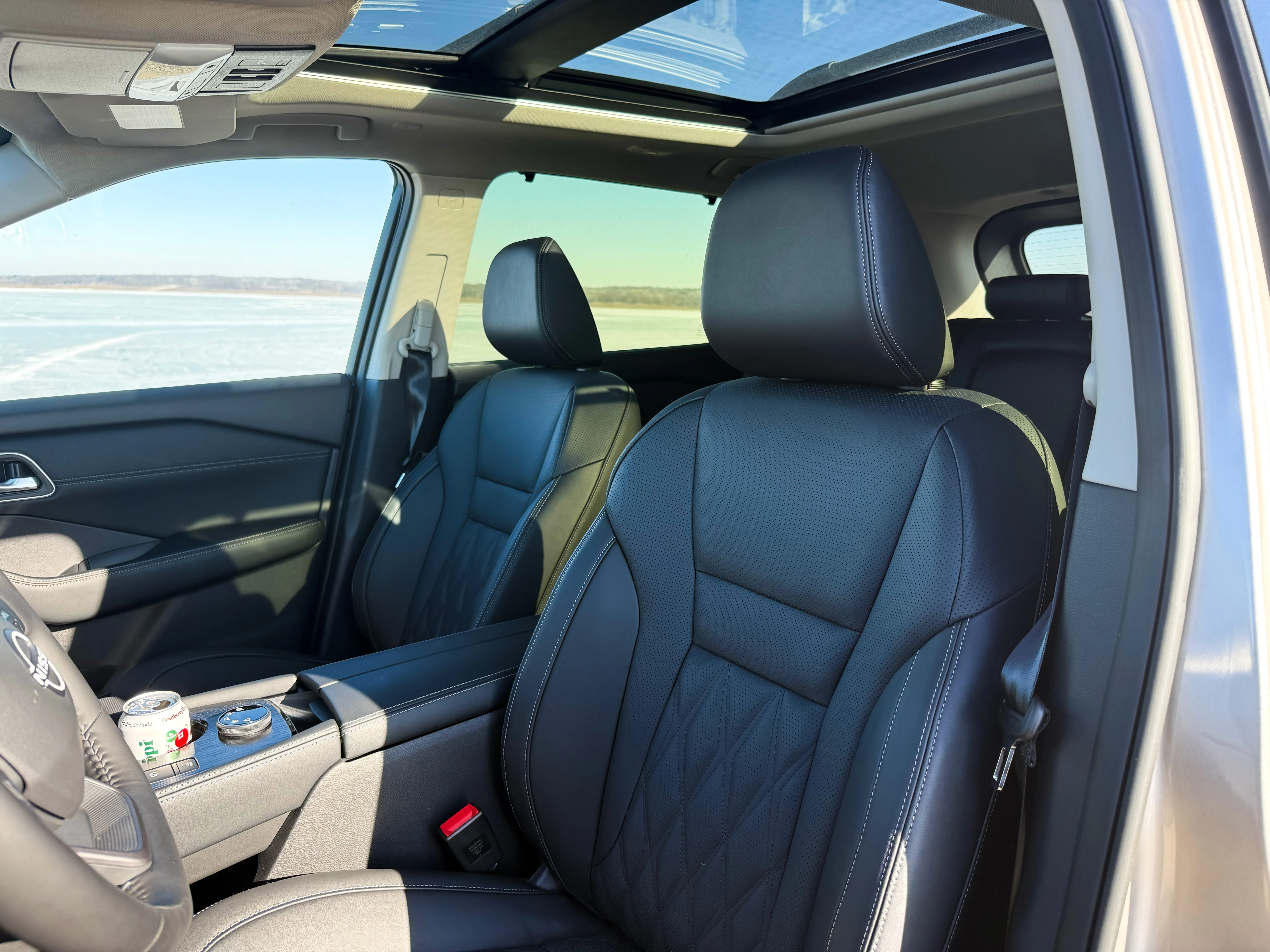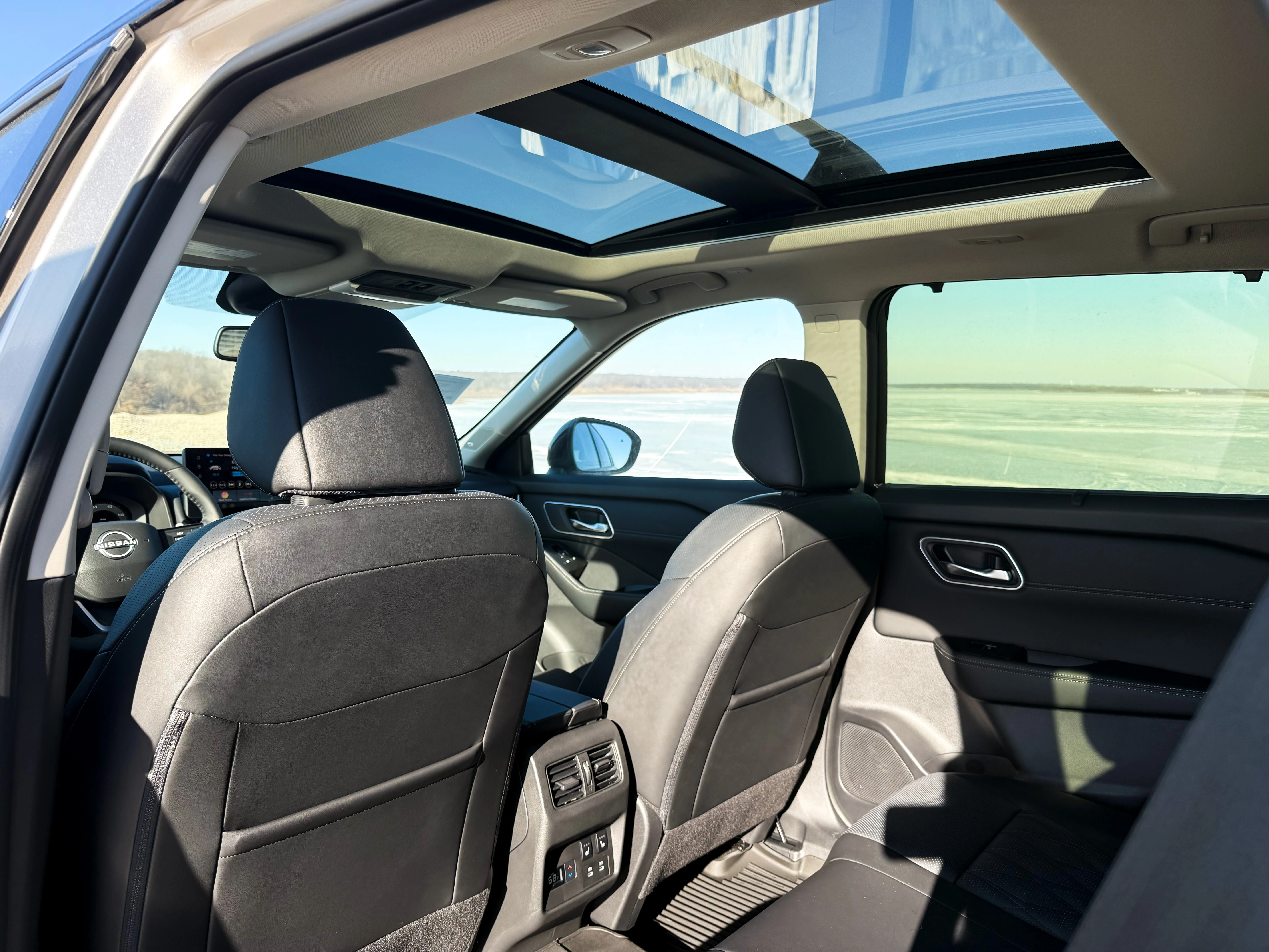 The cabin itself feels premium without trying too hard. Nissan redesigned the interior for 2026, and you notice it immediately, from the materials to the quietness on the highway. There’s also a huge panoramic sunroof, and even though it was a winter trip, it made daytime drives feel brighter and more open.